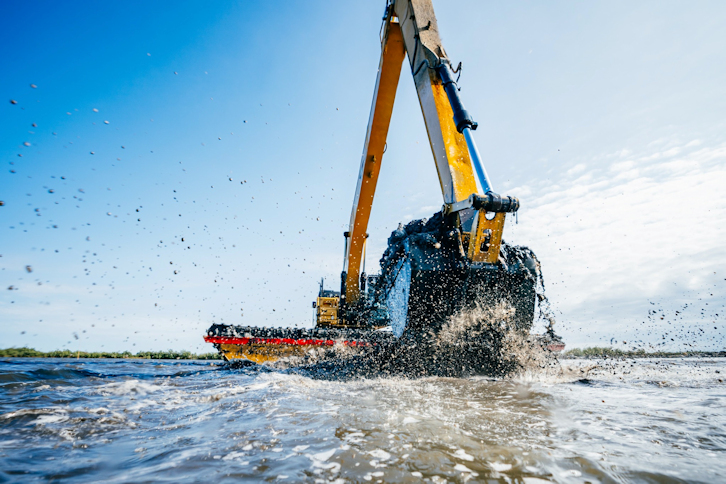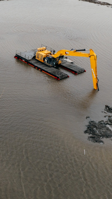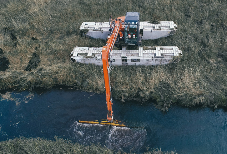 És hogy milyen munkákat végeznek leggyakrabban a kétéltű kotrók? Természetesen előszeretettel használják őket folyók és állóvizek kotrására ott, ahol az üledékképződés és a vizekbe jutó hulladékok felgyülemlése gátolhatja a természetes áramlást vagy akár árvízveszélyhez is vezethet. A hordalékok kiemeléséhez több gyártó is kínál speciális „gereblyés” kanalakat, a megfelelő hatósugárhoz pedig szinte mindig hosszított gémes kotrók kerülnek az úszótalpakra.